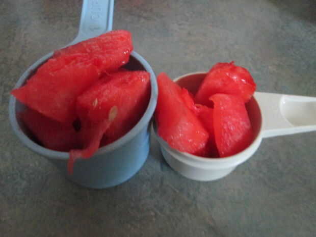 Colocar las tazas en la bandeja y reservar. Poner la sandía