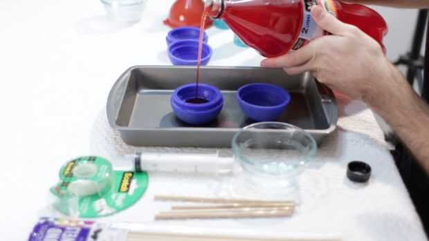 OK para esta primera paleta, quisiera hacerla de dos colores (Fruit punch superior e inferior de Sprite). Así que para ello, primero llenar la primera mitad del Molde de silicona de estrella de la muertede. Luego ponemos la tapa. Hay una pequeña muesca en la parte inferior, así como en la parte superior, para que usted sepa hasta dónde. Después ponga su palo en el agujero. Ahora éste irá en el congelador es de 3 a 4 hrs.