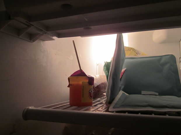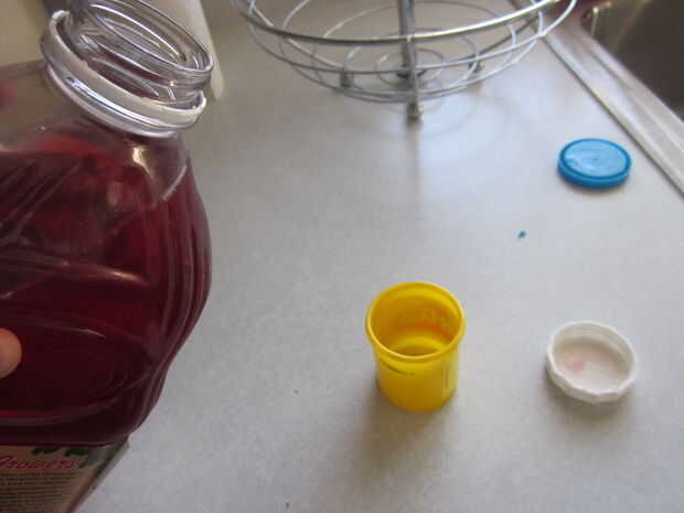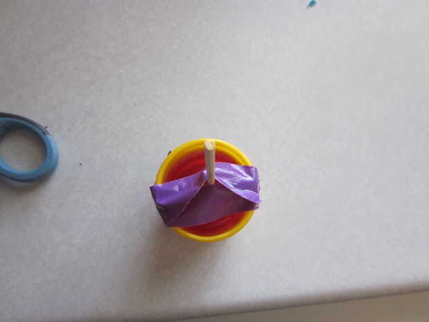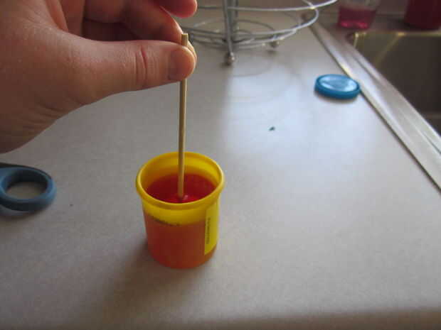 En primer lugar, vierta el jugo en el envase de la plastilina. Luego tomar pincho y conducto de cinta en su lugar. Poner en el congelador durante al menos una hora.