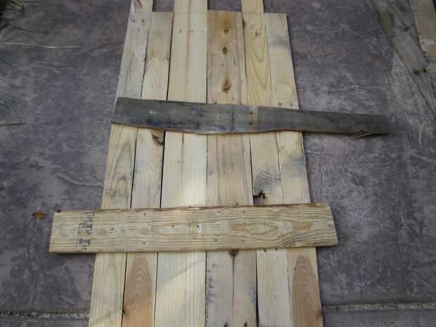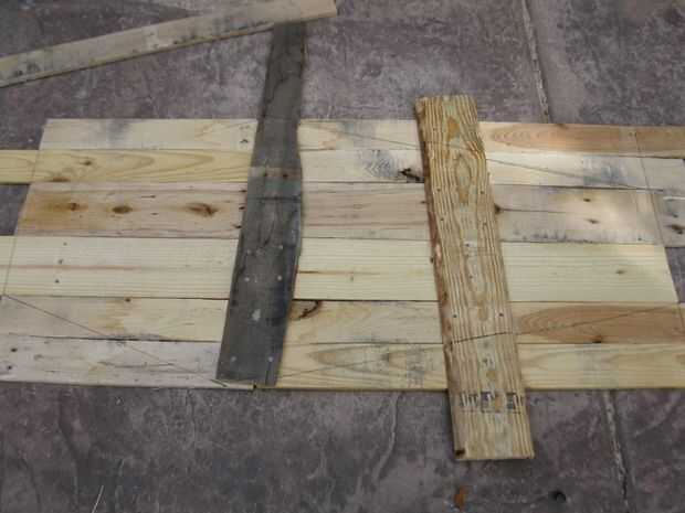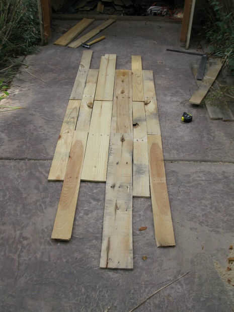 Con los listones de madera que he seleccionado organizado offset para la articulación de un par de listones no eran incluso con los de las articulaciones adyacentes a ellos. Este patrón debe dar a los paneles de mayor fuerza. Para fijar los listones juntos atornillado dos listones sobre las articulaciones. Coloqué un poco oblicuamente para darles un aspecto desigual.