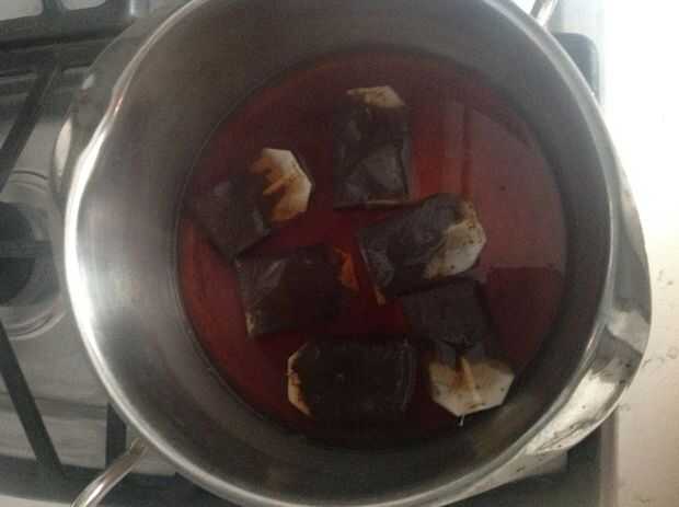 2. a continuación añadir todos 6 bolsitas de té en el agua, y mezcle todo y luego baje el calor. Empapar el té hasta que es muy fuerte (5-10 minutos dependiendo de tu té) quitar las bolsitas de té y deje que la mezcla se enfríe durante 10 minutos.
