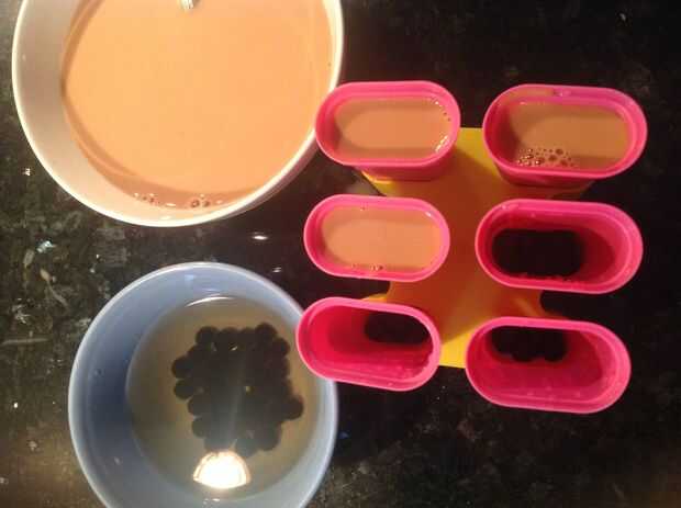 1. sacar algunas de las perlas de tapioca en el jarabe que hecho y dividirlos entre los moldes. Luego llene el espacio restante en los moldes con la base de té de la leche, teniendo cuidado de no sobrellenar los moldes.