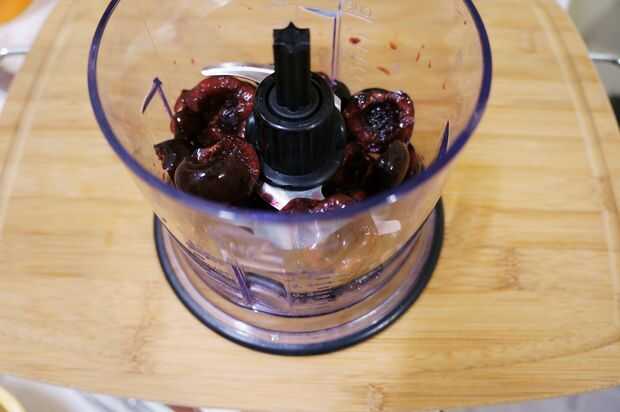 Añadir las cerezas, agua, vainilla, edulcorante y la sal en la licuadora y mezcla hasta que quede suave.