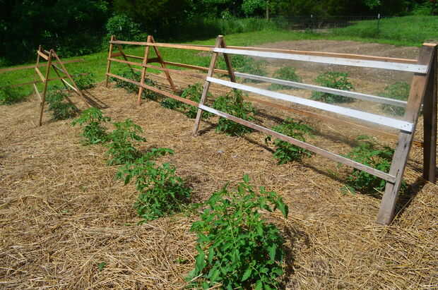 Había consiguió mis plataformas de una empresa de suministros agrícolas y tenía unos más largos que Segadoras de discos para las piezas largas que rasgó por la mitad en la Sierra de mesa. Las uprisers son sólo estándar cuatro pies plataforma placas atornilladas a un ángulo. Si no tienes acceso a las plataformas más como hice yo, eso está bien que tuyo será un poco más corto. Sólo ponerlos lado a lado por la longitud que desee. Tengo tres filas 24' que hacer. Hasta ahora he hecho lo suficiente para la mitad de mis tomates. Me gusta mi tomate :)