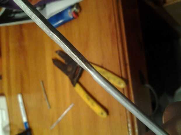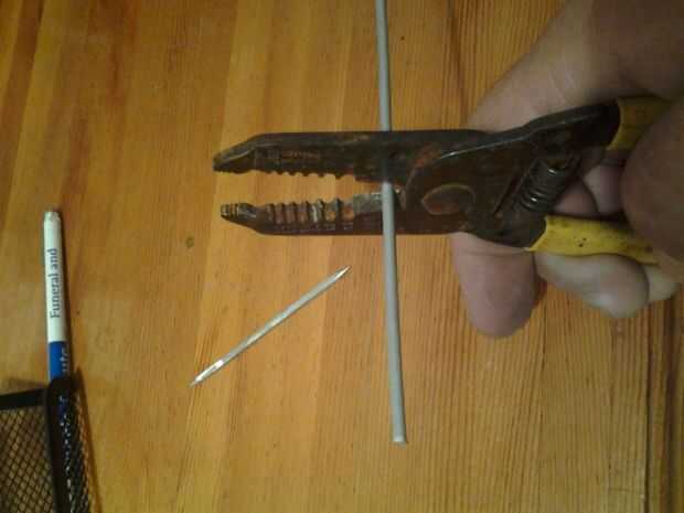 Comience cortando el aluminio para el legth deseada. A continuación poner el empate en el yunque (utilicé la cabeza de un martillo de 16 libras) Begin martillando suavemente hasta el borde superior se aplana ahora girar 180 y aplane el borde opuesto. Ahora 90 y que el borde. Entonces 180 otra vez y aplane el borde final. Ahora la corbata de aluminio debe ser cuadrada en un extremo y redondo en el otro. {Un} repetir el proceso en el otro extremo. Después de haber cuadrado ambos extremos utilizan el martillo en un ángulo para comenzar a formar las puntas puntiagudas.