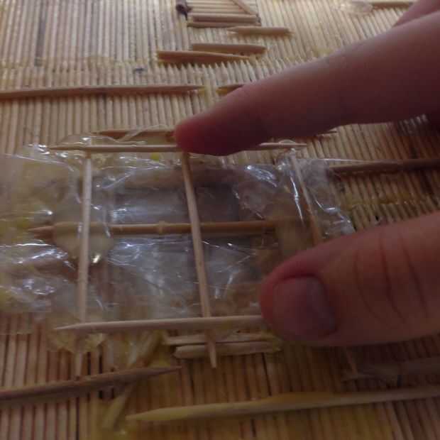Utilizar el celofán para cubrir las ventanas y coloque palillos como una cruz sobre el celofán.