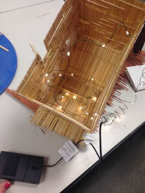 Usar las luces de alambre y pegamento en todo el interior de la casa. Asegúrese de que la caja de control conduce fuera de la parte posterior de la caja así que usted puede cambiar las pilas:)