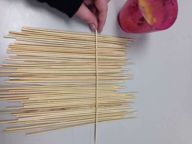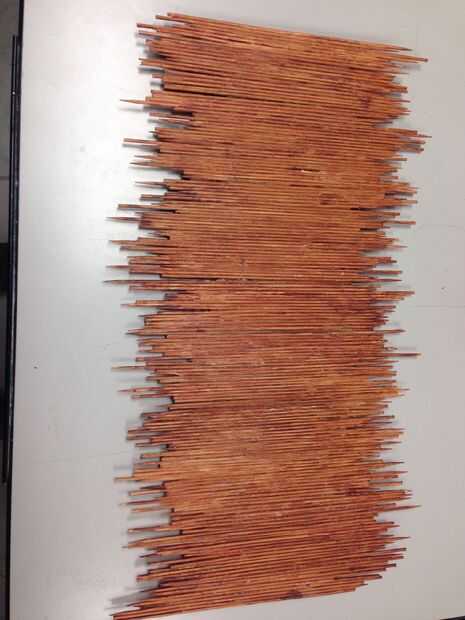 Empezar por los pinchos de la alineación irregularmente y pegamento de madera juntos. Luego una vez seco, pintar con un marrón descafeinado para una base ligeramente teñido de marrón.