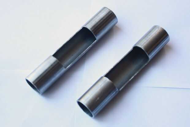 Utilice una sierra para cortar dos tramos de 5 pulgadas de la tubería redonda han dejado. La máquina o cortar una ranura (2 pulgadas de ancho, 1/2 pulgada de profundidad) en el centro de cada pieza y asegúrese de que la tubería rectangular encaja perfectamente en la ranura.