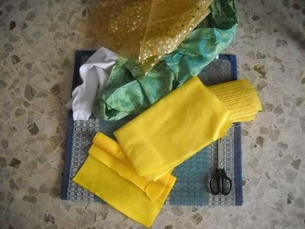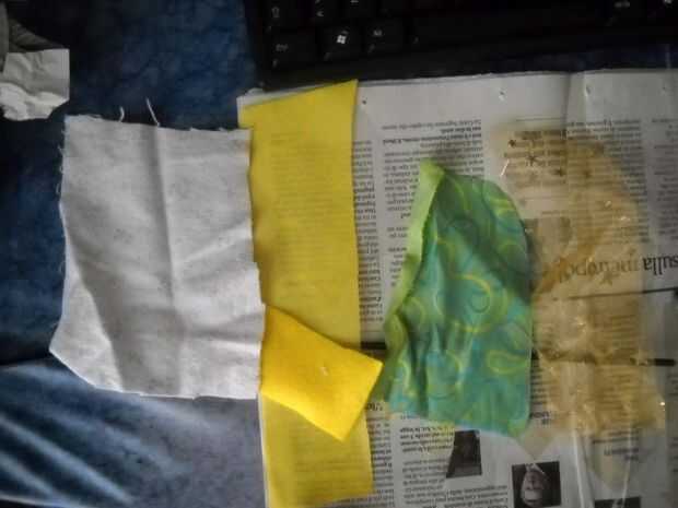 Con desechos de corte formas de plumas. Usé diferentes tipos de tela y una lámina de plástico.