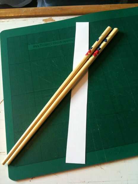 Muchos principiantes luchan para utilizar los palillos - esto puede ser más fácil si hay un bisagra/espaciador para mantener los palillos en la correcta alineación y separación. Estos pueden hacerse con la manga de papel que los palillos vienen envueltos en - mi Instructable utiliza un simple trozo de papel ya que no tengo ningún palillos freebie