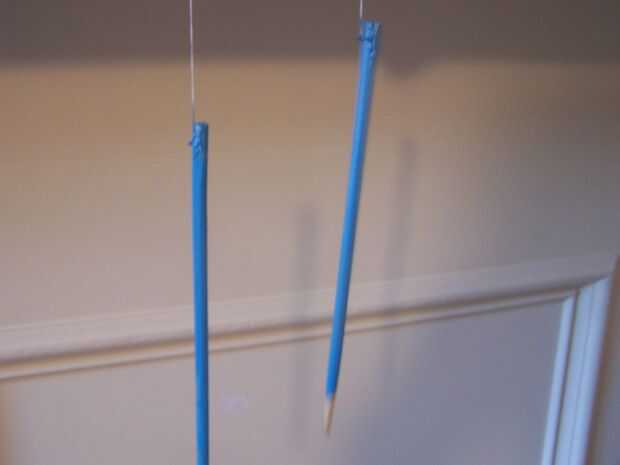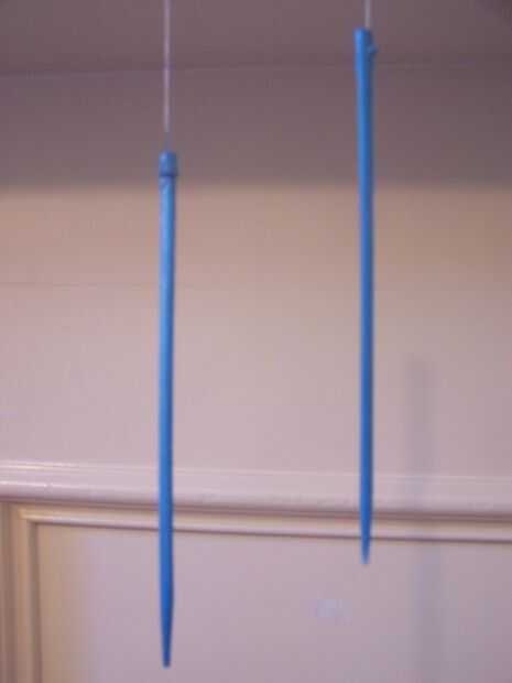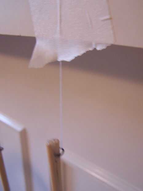Porque los palillos tienen que ser pintado todo, sugiero que les cuelgan de un contador pasando alguna cadena completa el bucle de alambre y cinta adhesiva la cadena a la barra. Esto ayudará con la pintura y secado. También pondría algún diario en los palillos de colgar.