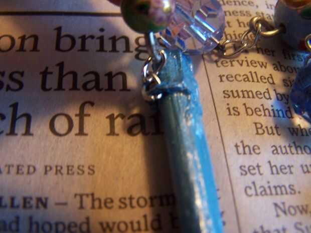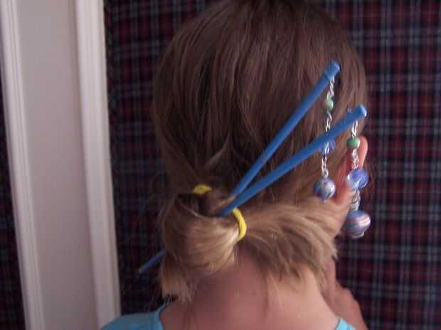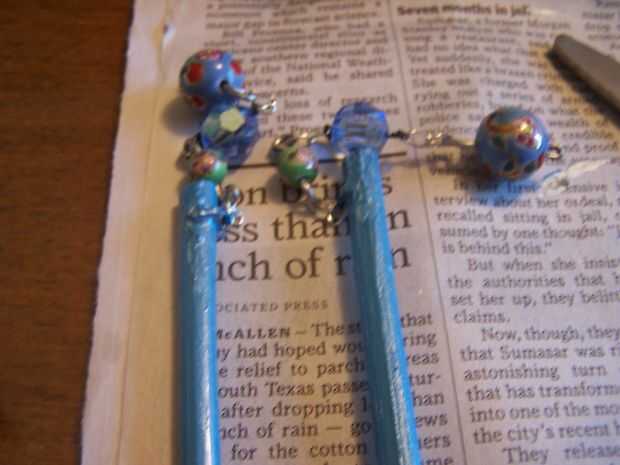 Ahora que los chopsicks son secos y los colgantes están listos, conecte los colgantes a los palos. Asegúrese de que no es pintura entre el alambre y el palo. Si el brillo es algo pegajoso, puede todavía colocar los colgantes, pero espere un rato antes de usar en el cabello.