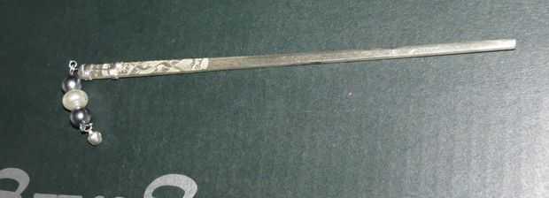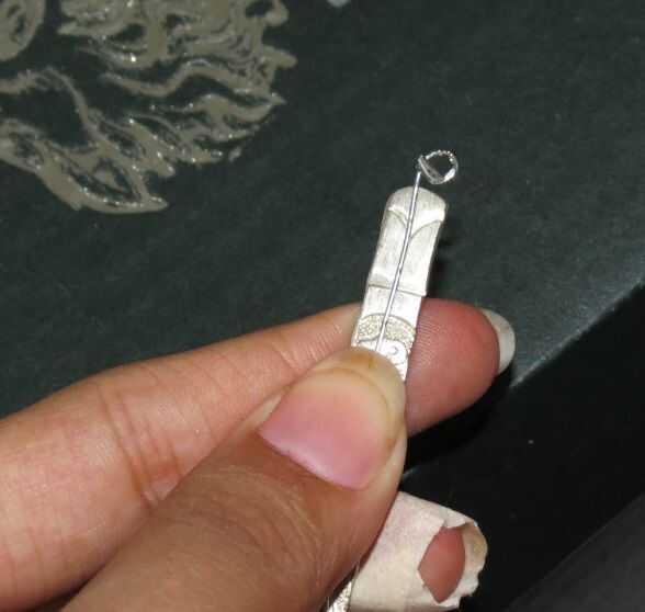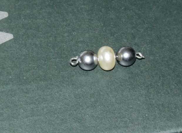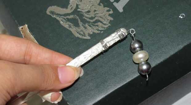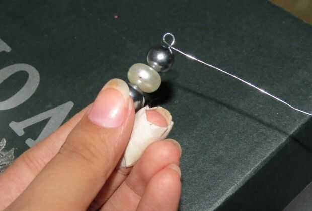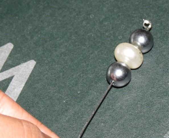 Palillo uno: haga un bucle en el extremo del cable y coloque las perlas y hacer otro bucle en el otro extremo. Corte el alambre sobrante. Toma otro cable forme un bucle con el extremo y doblar en forma de 'L' (ver foto) y que a los palillos y asegúrese de que se mantiene apretado. Ahora fije el adorno colgando perlado formuló a los palillos y una campana al final del Perla ornamento usando un anillo del salto.