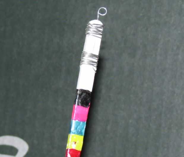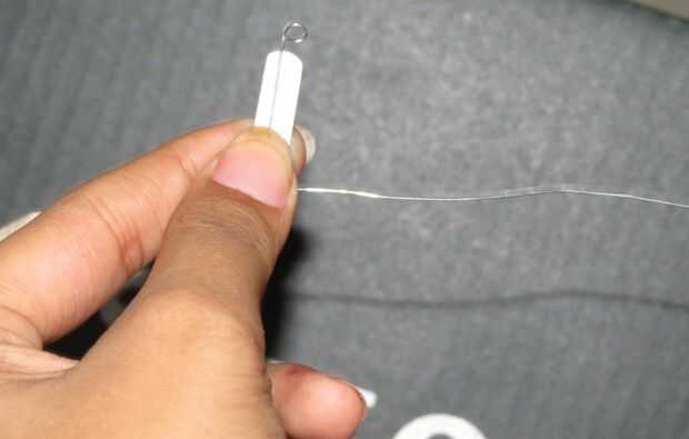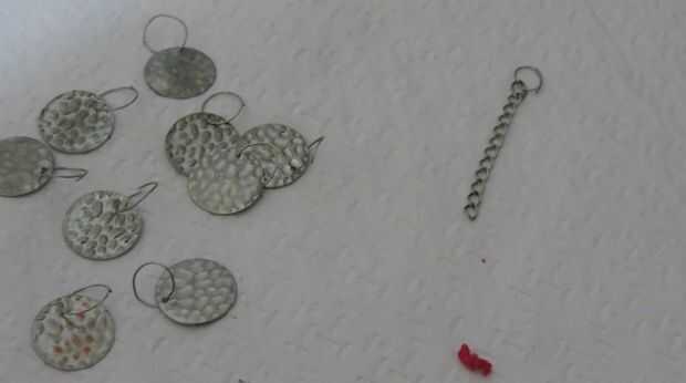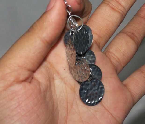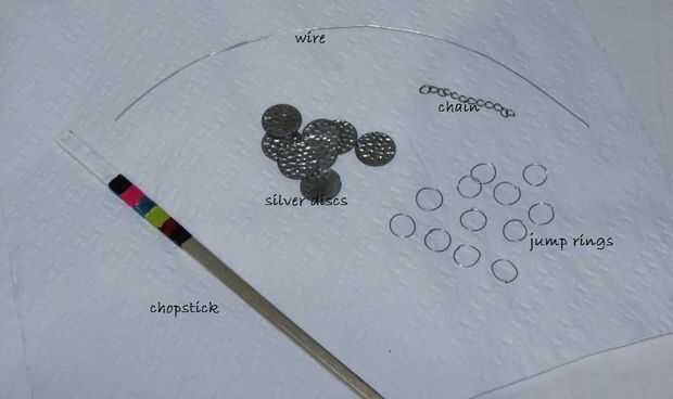 hacer loop en un alambre y doblarlo en forma de 'L' y fije el palillo. Colocar anillas a los discos plateados y un anillo del salto a la cadena. Y coloque los discos plateados en la cadena mediante los anillos de salto. Se verá como una pelea de disco de plata. Fíjela a los palillos.