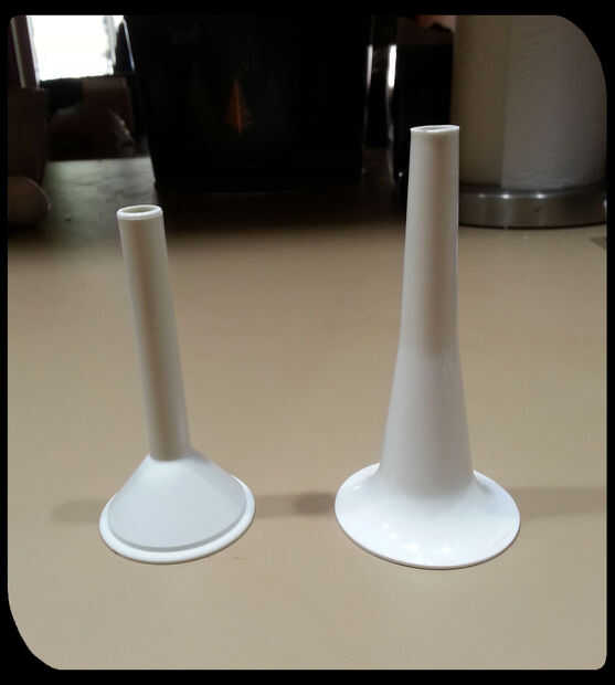 Foto de arriba hay dos tubos de relleno. El de la izquierda es de un arma desigual, el de la derecha es del aditamento para la batidora stand. Si observas, el uno a la derecha es cónico, y como resultado, la carcasa no se deslizará sobre la boquilla de la manera que necesitamos. El de la izquierda tiene forma cónica no y afortunadamente, también se adapta a nuestro aditamento para la batidora stand.
