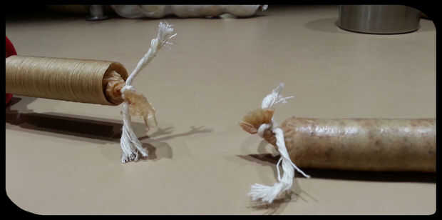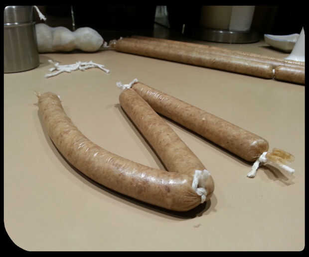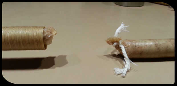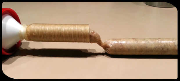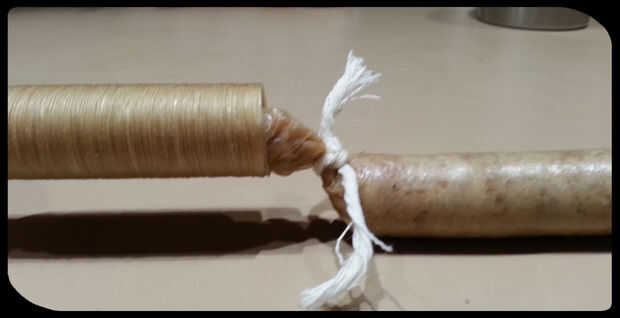 Llenar la pistola. Deslice la cubierta sobre la boquilla y asegúrese de que está empatado al final. Mientras usted mantenga su mano alrededor de la carcasa para proporcionar una resistencia un poco, tiene su ayudante haga clic en la pistola para que la carne fluya dentro de la carcasa. Al llegar a la longitud deseada, ata el extremo como en la imagen. A veces ayuda a dar a la caja un toque primero. Cortar la cubierta y luego ató el extremo izquierdo de la pistola de desigual. Repita este proceso hasta que el arma está vacío. Recarga el arma y continuar hasta que se rellena toda la carne en la tripa.