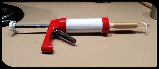 Este es mi método preferido para relleno de cubiertas para palos de snack. Usted no tiene que preocuparse de carne deslizarse más allá del empujador, y la pistola tiene suficiente carne para 3 sticks de snack de longitud media. Para este método se utiliza la misma boquilla como el método anterior, instalar en el arma de este tiempo.