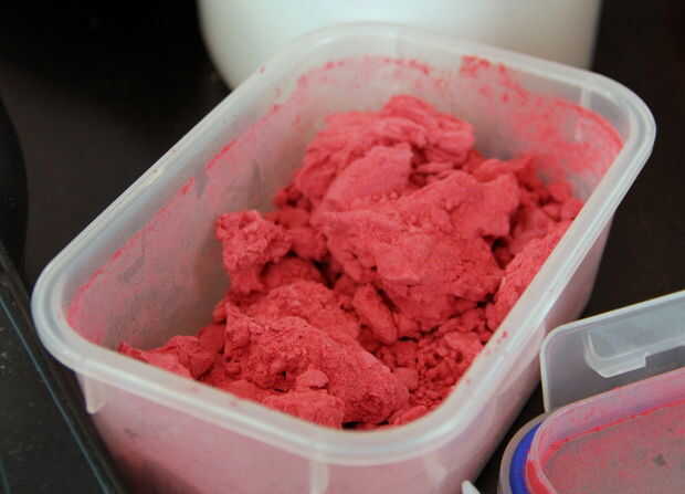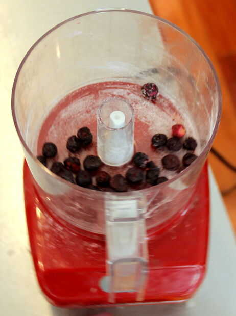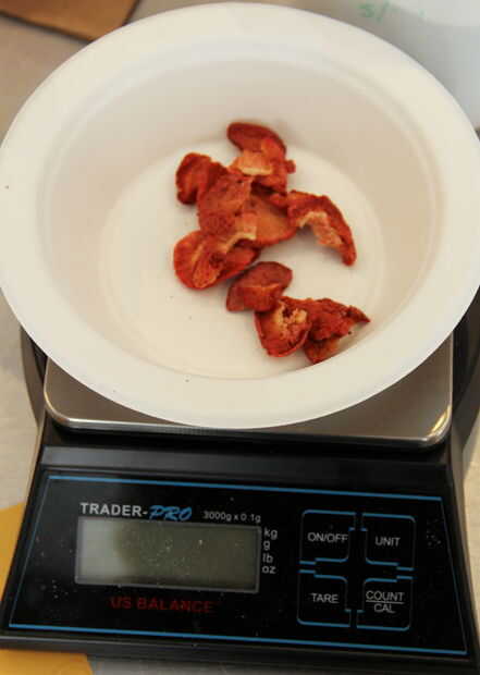 Pesar la fruta liofilizada, luego moler en el molinillo de especias. (O moler un montón, luego pesar 5g.) Si vas Low-Tech, un mortero y una maja trabajaría demasiado.