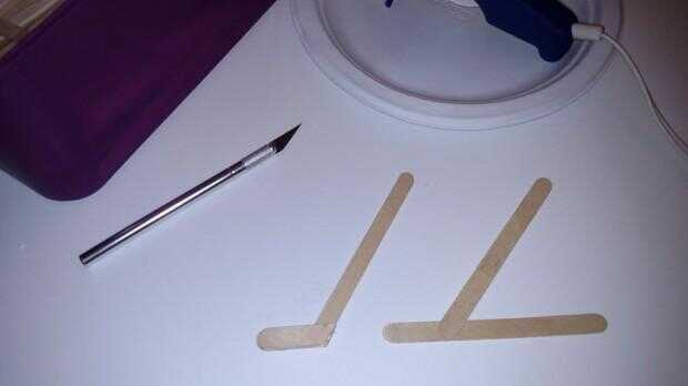 En la imagen superior puede ver el primer palillo que creé en la izquierda y la que estoy construyendo en la derecha. Colocar los palillos como se ve en la foto y tratar de probar al ángulo deseado el palo y cuchilla para conocer. Una vez encuentras el puntaje de ubicación el palo horizontal por lo que puede recortar la longitud del palo horizontal para hacer la hoja.