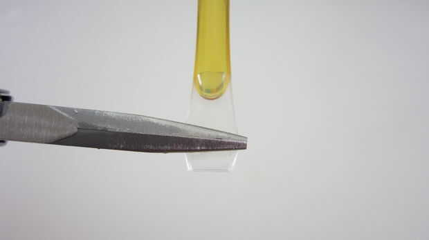 El extremo de la pajilla donde se agrega la miel todavía tiene algún residuo de miel así que queremos sellar el otro extremo primero. Tomar la aguja alicates y pellizcar el extremo limpio de paja cerrado. Quieres tener cerca de 1/8 pulgada (3mm) de la paja que sobresale más allá de las pinzas.