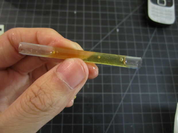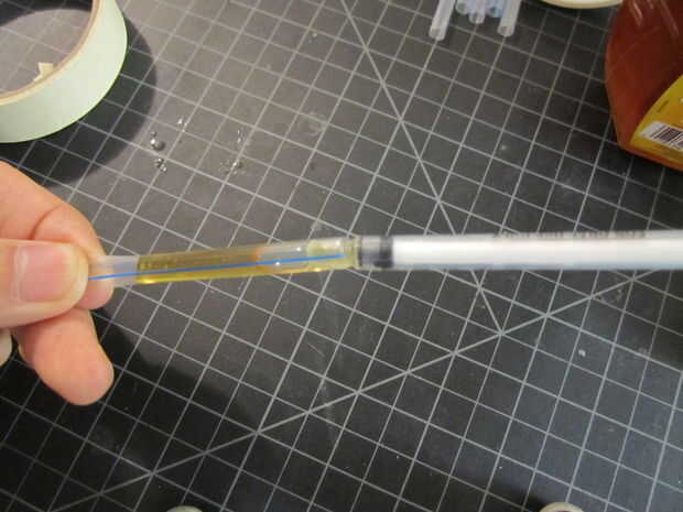 A continuación, inserte la punta de la jeringa en un extremo de la pajilla e inyecte la miel. Asegúrese de dejar algo de espacio en ambos extremos de la paja. (ver imagen) El espacio no tiene que ser igual, sólo asegúrate de tener al menos 1/2 una pulgada de espacio. Esto hará que el proceso de sellado mucho más fácil. Después de varios intentos, aprendí que es mejor hacer la paja nivelada horizontalmente con la jeringa. Si usted sostiene en un ángulo la miel fluirá hacia abajo en un ángulo y a su vez con crear bolsas de aire.