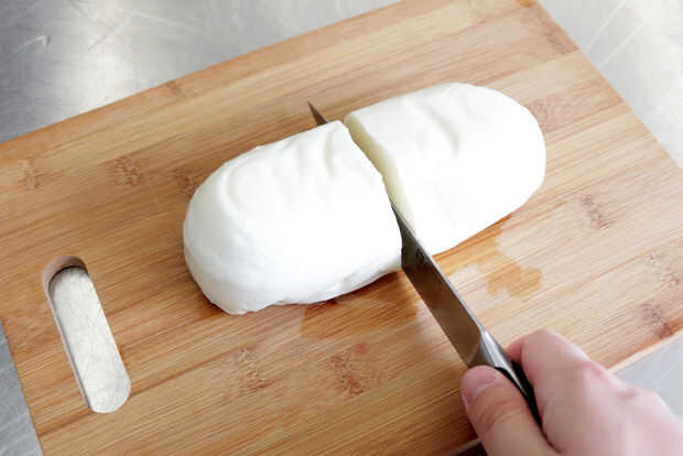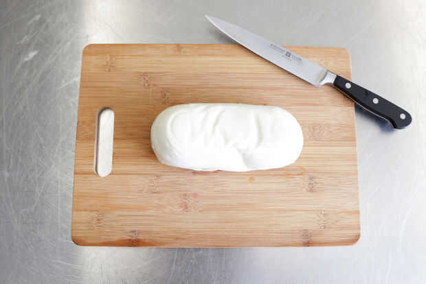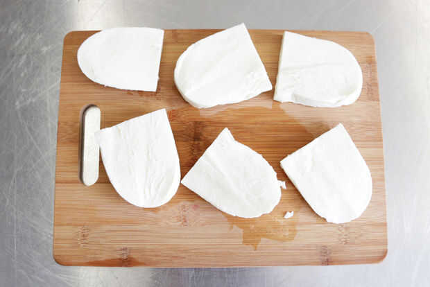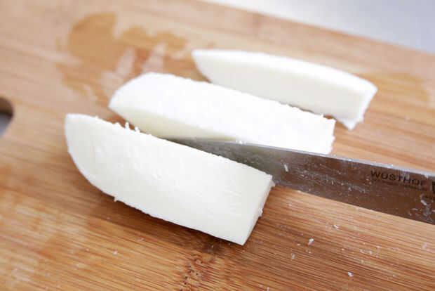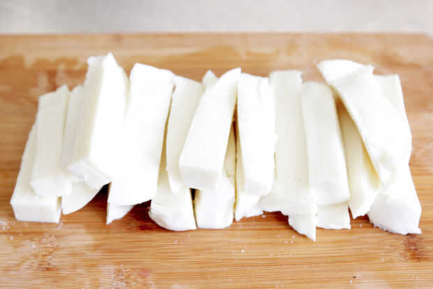 Cortar el queso en tiras de 1/2 "espesor de aproximadamente 3" a 4" de largo.
