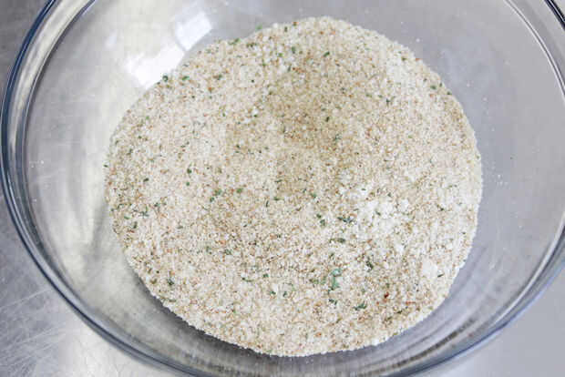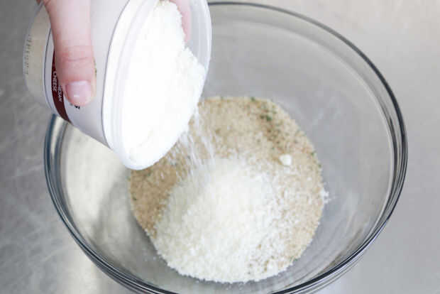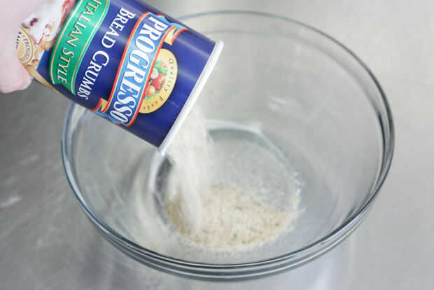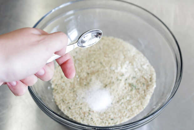 En un tazón grande mezcle las migas de pan, el queso parmesano y la sal.