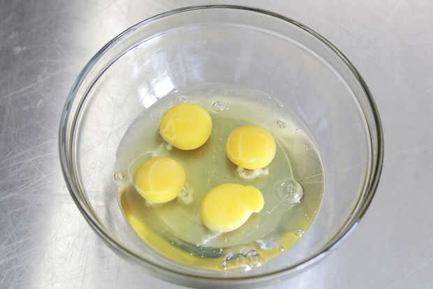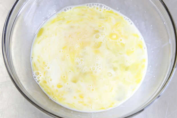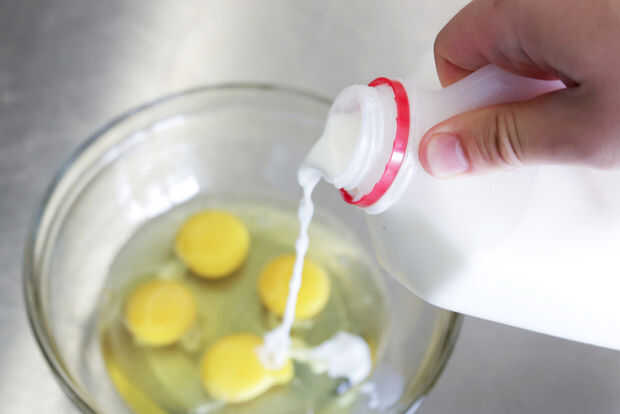 En otro tazón, mezcle los huevos, la leche y el ajo.