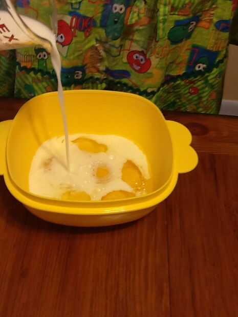 En un recipiente aparte, batir 6 huevos y una taza de leche juntos. * Romper los huevos en el lado de la taza, no la cabeza de tu hermana!
