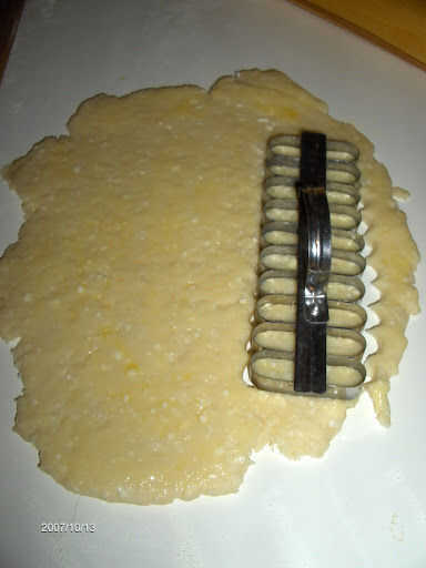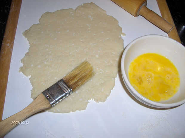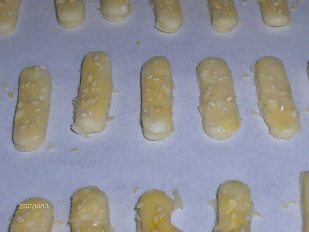 Cortar la manteca en la harina hasta conseguir la textura grumosa, agregue el resto de los ingredientes, amasar. Dividir la masa en 2 porciones, rodar cada plano, pincelar con huevo batido y rebanada con cuchillo (si tienes cortador de la galleta como se muestra en la foto, todos decir, utilizarlo como es más fácil, pero da palos más cortos). Espolvorear con cualquier relleno de su elección, usé semilla de sesamo blanco esta vez. Cueza al horno precalentado 200 c (395 F) durante 20-25 minutos (hasta que se dore).
