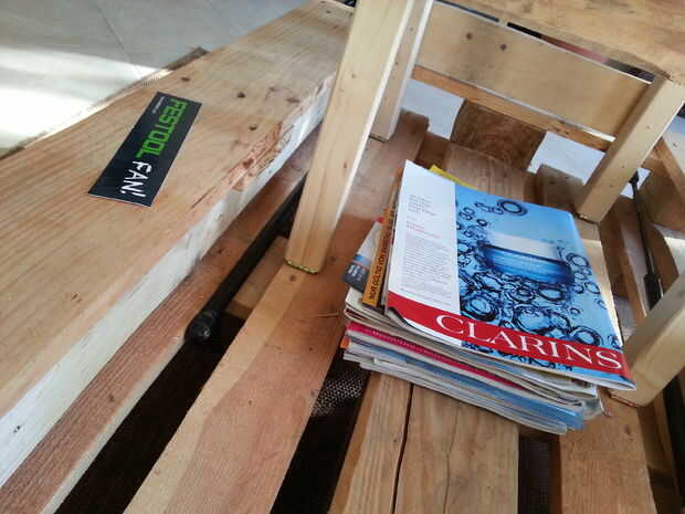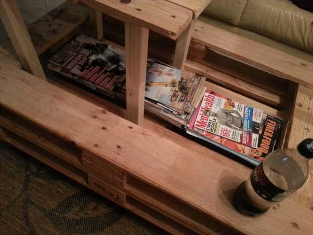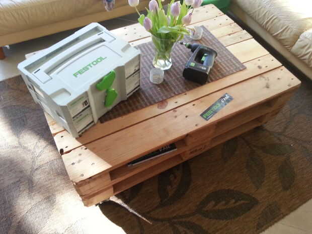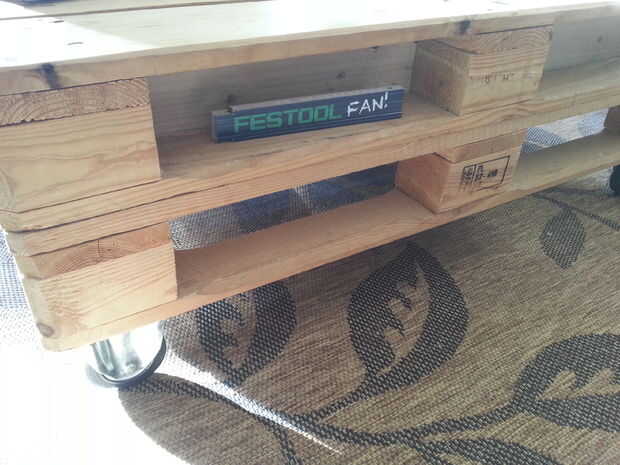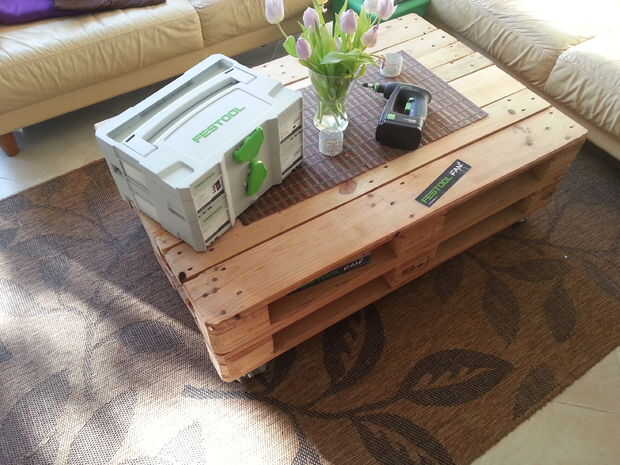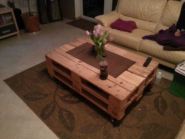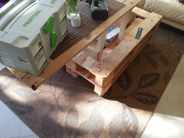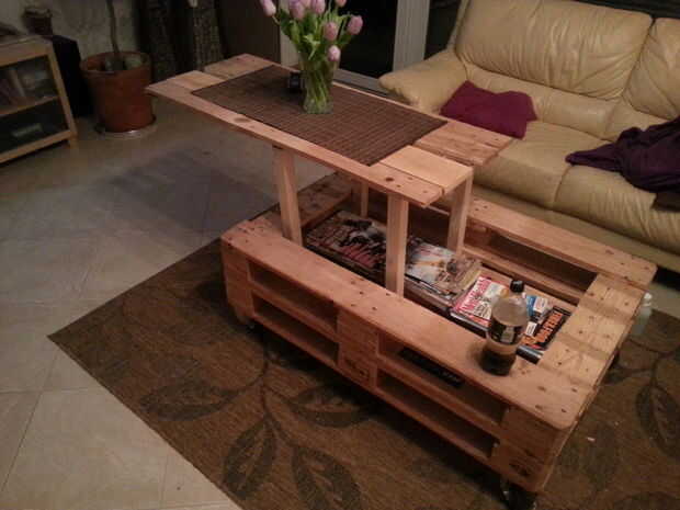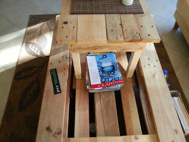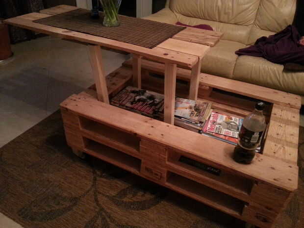 Yo hecho mesa de centro hecha de europalets con un área de almacenamiento de información integrado dentro y un mecanismo de elevación que puede levantarse fácilmente 15 kg.