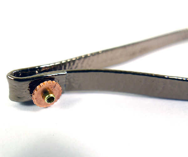 Utilizando el punzón de abalorios, ensanchar los orificios realizados en el cordón. Doblar el cordón y la lezna de rebordear para caber un ojeteador de cobre amarillo en los agujeros pasando por los tres orificios. Ponga un acento fascinante en el extremo de la anilla tal como se muestra. Ajuste del cordón, ojal y acento en la herramienta de abocinamiento de ojete y flare el ojete.