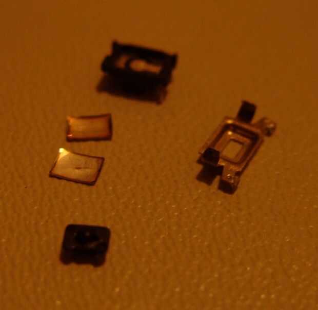 Después de retirar el interruptor, levante las lengüetas de metal aparte hasta que todo cae aparte. Verás dos coronas metálicas, utilizados para proporcionar la fuerza del resorte y retroalimentación táctil cuando se presiona el botón de encendido. Compruebe que el cuerpo del interruptor-it está probablemente sucio. Esto es lo que hace que el interruptor no, y por qué falla intermitentemente antes de que finalmente se cierra completamente de trabajo. Limpiar con alcohol en un q-TIP, luego limpiar las cúpulas y lo pones de nuevo juntos. Soldadura en el PCB y montar el caso.