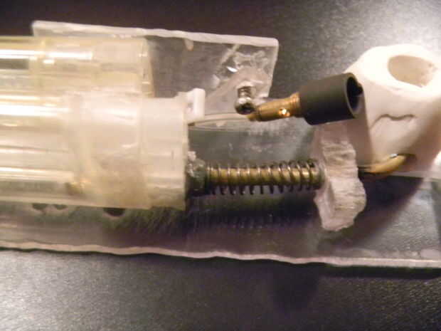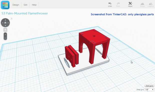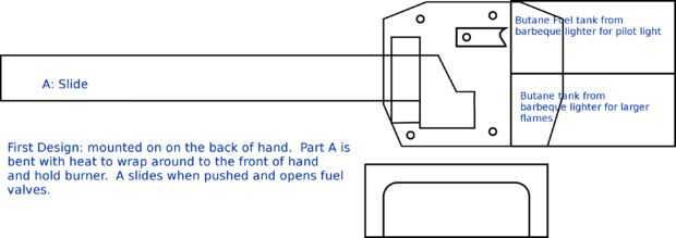 Para lograr esto, originalmente quería poner las piezas funcionales de los lanzallamas, palancas y combustible, en el dorso de mi mano, dejando sólo el quemador en mi palma. Esto terminó siendo difícil de cortar las piezas para hacer a mano porque el diseño que había venido para arriba con tenía muy pequeñas partes implicadas. El plexiglás que usé para hacer las piezas terminaron por no ser lo suficientemente fuerte para la idea que tenía en mente, incluso en diferentes espesores.