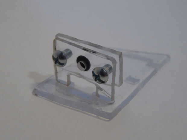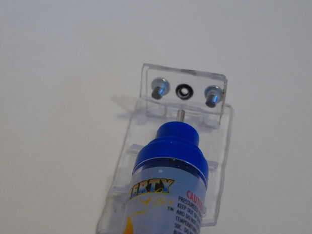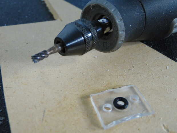 Dos piezas de plexiglás se cortaron, y una sección pequeña en el orificio central fue molida hacia fuera usando una herramienta giratoria Dremel. Esta depresión en el plástico tendrá un pequeño #8 Junta tórica. Las dos piezas de plástico pueden ser atornilladas. Esto aplica presión a la junta tórica y ayuda a mantener todo seguro. Termine aplicando pegamento entre las capas de plástico sólo para asegurarse gas no se escape hacia fuera. El plástico también permite que el butano que se lanzará, el frasco se presiona contra él para abrir la válvula incorporada.