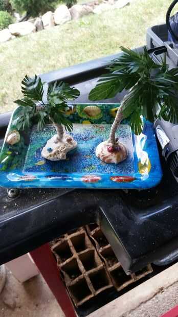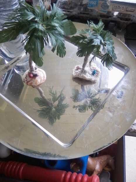 He añadido algunos arena y pequeñas conchas a mis árboles acabadas. También podría añadir pequeñas perlitas marrones como cocos. Encontré que el pegamento brillante del dólar tienda trabajado mejor para mantener mi arena de mi para todo uso pegamento hizo. Lo que funcione!