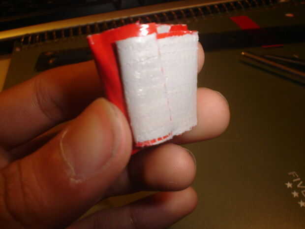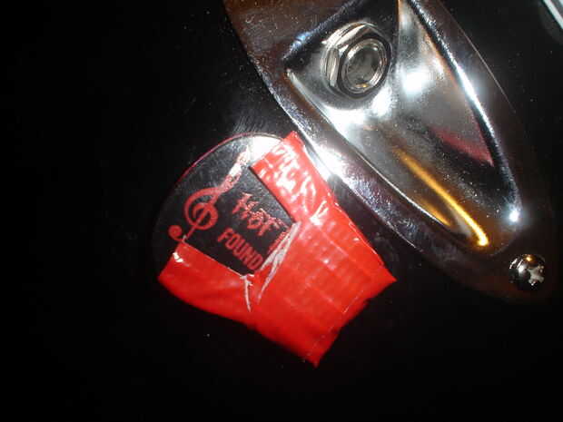 Corte una pequeña franja y envuélvala en un círculo (lado pegajoso hacia afuera). pegar esto en la parte posterior de la caja y a su guitarra.