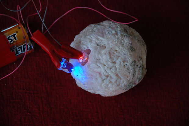 Por lo tanto, puse 3 baterías juntos, atado con alambre 1 rojo y 1 azul LED en paralelo (con la esperanza de obtener púrpura), había pegado en la Geoda y establecer todo en un vaso de bambú para mantener los pinceles de un artista. Por el momento, el retorcer juntos para activar o desactivar la luz, pero un interruptor pequeño perforado a través del lado o el fondo de la taza completa la lámpara.