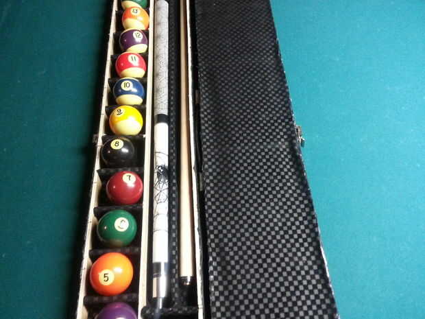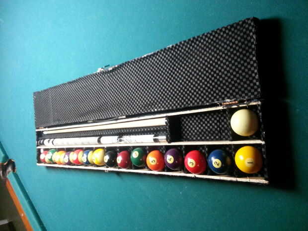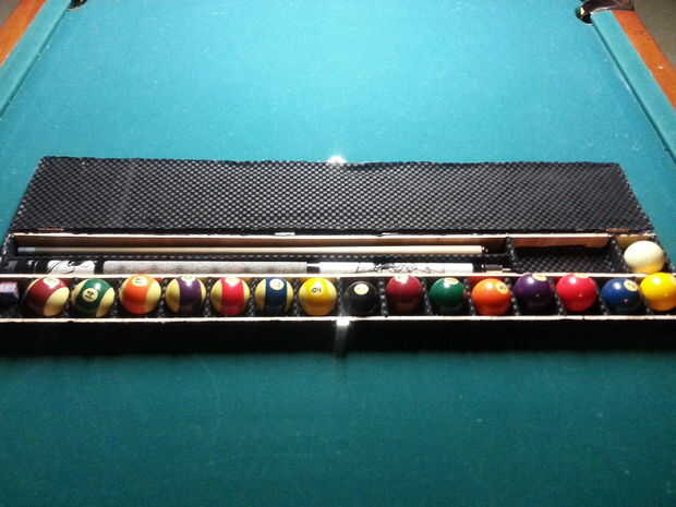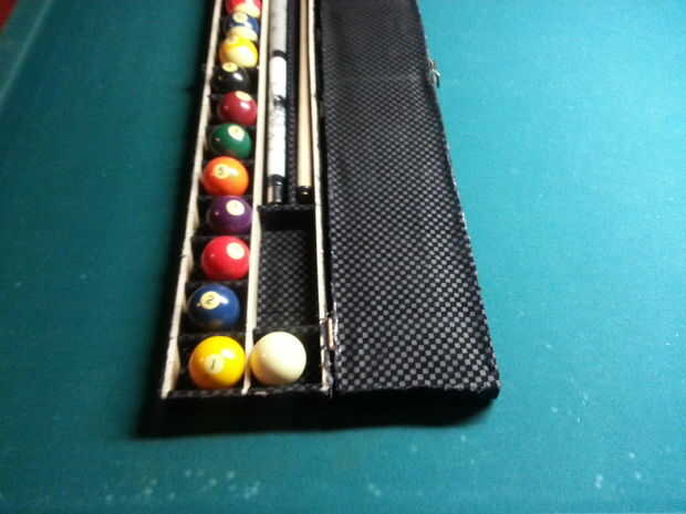 El caso que hice tiene 15 bolas de billar, la bola, un cue, tiza y hay suficiente espacio de sobra para un montón de extras. Como un poker, modeladora e incluso herramientas de reparación si así lo desea. Todavía tengo que llenar el espacio vacío con extras. Ahora desde que hice este caso todas las bolas piscina 15 y una bola y un taco es más grande que el caso de la señal promedio, ya que un caso de referencia se realiza para mantener sólo una cue. Este caso es 40 1/2 pulgadas de largo, 6 1/2 pulgadas de ancho y 3 pulgadas de alto. Una preocupación personas tenían cuando les mostré a ellos era el peso, y una vez que llevó a cabo con todo dentro de ellos estaban sorprendidos. Suena como que pesaría mucho pero realmente no es así. También es muy fácil y cómodo de llevar.