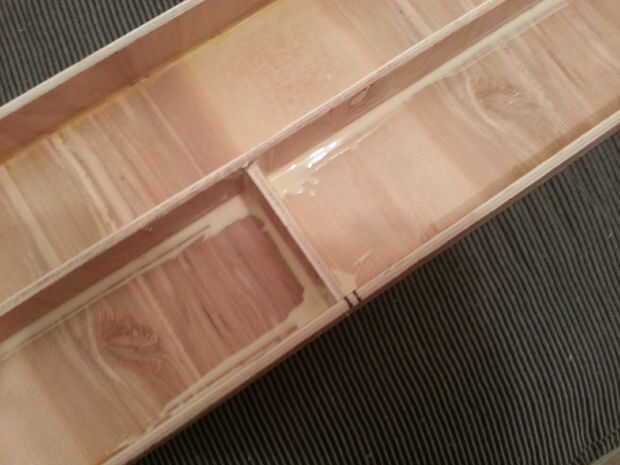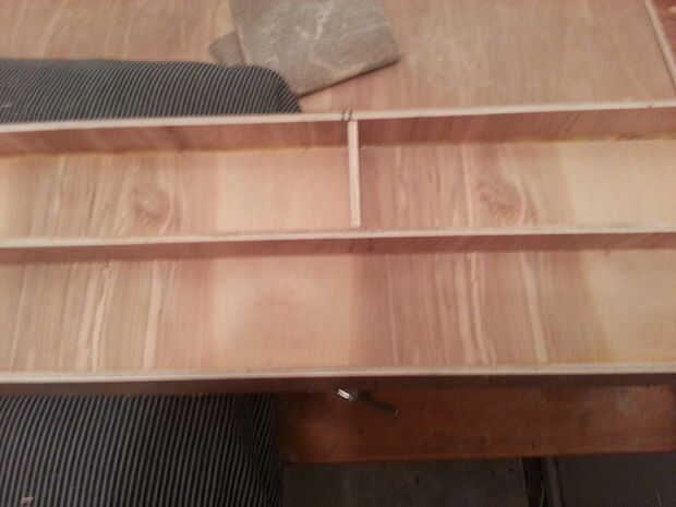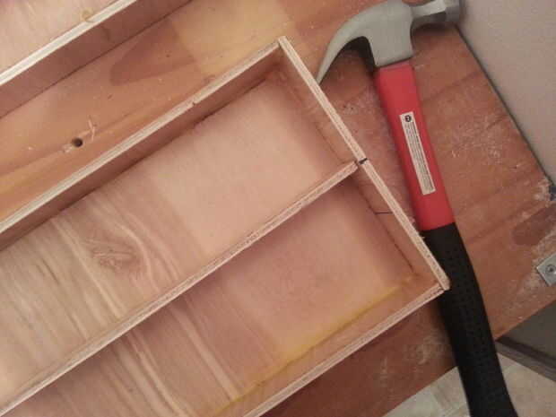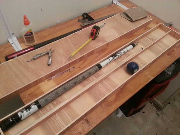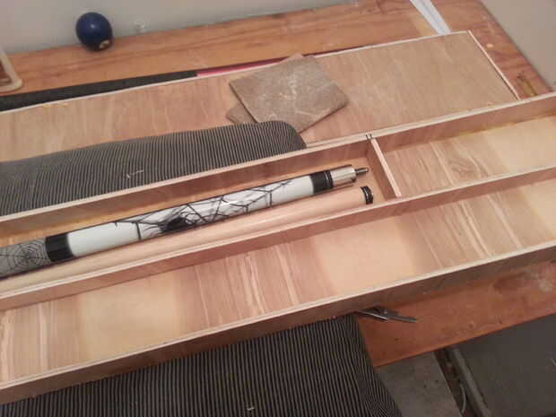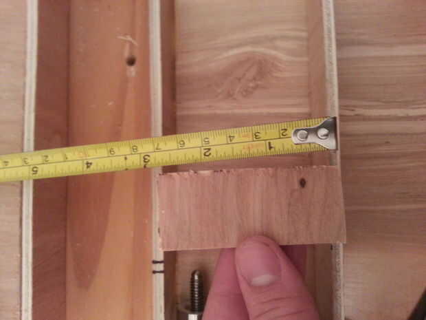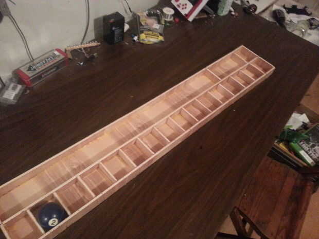 Después el pegamento de madera es hora de añadir las paredes dentro de la caja. Necesitamos otra pieza de madera que es 40 1/2 pulgadas de largo por 1 1/2 pulgadas de alto. Se trata de la madera que divide el caso en la sección de localización y sección de la bola. Después de tener la madera cortada a la medida, colocar en el centro de la caja y clave en su lugar y luego pegue la madera. Entonces tendrá que cortar un pedazo pequeño de madera para colocar después de la señal. pegamento de madera y del clavo también. Entonces usted necesitará 15 piezas de madera para los divisores de bola. 1 1/2 pulgadas de 3ish pulgadas de largo. Tendrá que medir la distancia de la pared de División Centro en la pared caja de outter luego hacer las paredes de división de 15 bola basadas en esas medidas. Después de cortar y lijar, los espacio de 2 1/2 pulgadas una de otra sobre el caso. Clavo y madera pegamento. Usé pegamento caliente para mantenerlas en su lugar antes de clavarlos. Será necesario otro pequeño pedazo de madera para hacer la pared de división de la bola. ver la imagen por eso.
