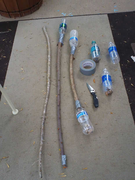 Una rama buena, robusta, entre 36-48 pulgadas largos y no más grandes alrededor de cada extremo que el cuello de la botella de agua. Tiene que caber dentro del cuello de la botella. No desea la rama tan flaco la botella se balancea o no estancia una vez conectado.