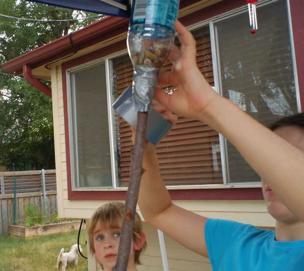Inserte el extremo del rama en el cuello de la botella unos 3 o 4 pulgadas. El palillo debe caber cómodamente en la boca de la botella. Si es demasiado flaca, envuelva el extremo de rama con cinta adhesiva varias veces (en cada extremo), hasta que esté lo suficientemente espesa para las botellas hacer un ajuste apretado.