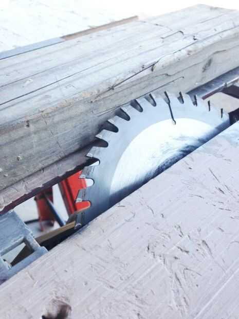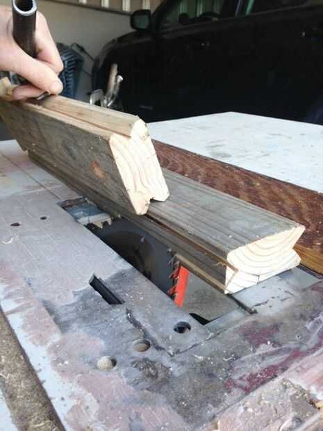 Establecer la hoja de sierra a 45 grados y ajustar altura de la cuchilla por la parte superior de la hoja es en la marca del punto medio. Establecer la guía para una pieza "V" se retira, pero deje suficiente área plana, demasiado. (Quité un poco mas que yo quería y utiliza un plano de la mano en el área plana para hacer la "V" más pequeñas y los pisos más amplia).