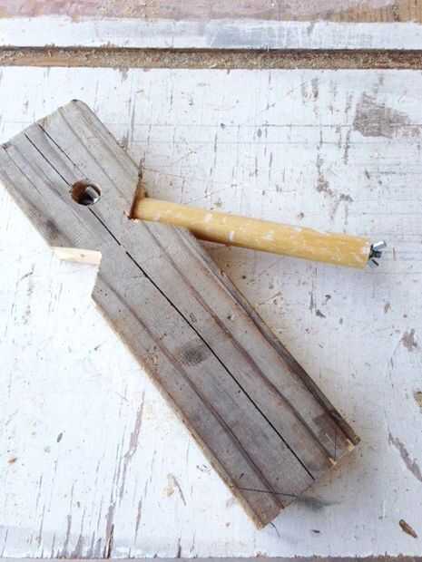 Cortar la varilla roscada. Usé un alicates de punta para mantener una tuerca de mariposa, mientras que la varilla roscada en la 2 x 4 y la tuerca de mariposa. Deslice la manija en la varilla roscada. Añadir otra tuerca y apriete.