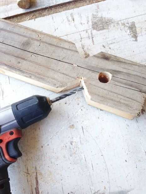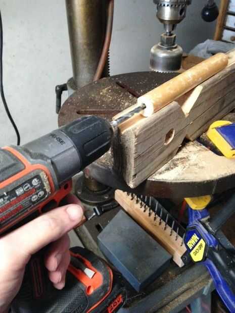 Se utilizará un palo de escoba de la manija. Habrá una barra roscada a través del centro de la manija y en la 2 x 4. Taladro en ángulo recto al lado de cada muesca más cerca del agujero en la 2 x 4. Seco colocar la pieza de la manija y determinar cuánto tiempo hacerlo. Corte a la longitud. Perfore un agujero de 1/4 de pulgada a través del mango. (Esta parte era difícil. El mango es más largo que mi broca. Perforé desde cada extremo, pero los agujeros no se cumplió perfectamente en el medio. Manejé una varilla de 3/16 de pulgada a través de romper el agujero en el centro. Luego conduje una varilla de 1/4 de pulgada a través del orificio. Pude hacer los agujeros de satisfacer.)