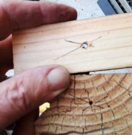 Centros de la marca de la pieza final y el final de la 2 x 4. Taladro para un tornillo de drywall. Asegure la pieza final del 2 x 4 como se muestra en la segunda foto. Si la pieza final se mastica cortes de sierra, afloje el tornillo de la mampostería seca un poco y darle la vuelta final para el final. Reemplazarlo cuando ambos extremos están demasiado mal masticados. La versión Woodsmith no permitió que el pedazo de extremo los bancos, pero necesario reemplazarlo.