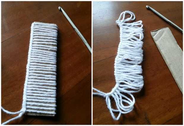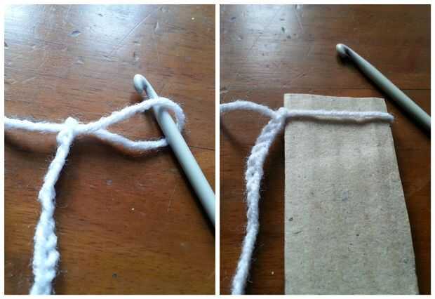 Después de que usted está haciendo las cadenas usan el ganchillo para sacar la última puntada de cadena de aproximadamente una pulgada, quitar el gancho del lazo y pasar la última cadena de la pieza de cartón. Jale el extremo suelto del hilo para apretar el lazo con el trozo de cartón.