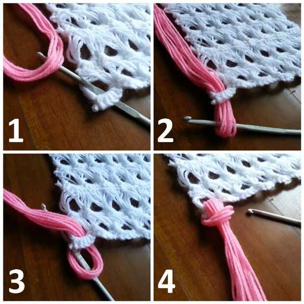 Use el gancho para sacar el bucle a través de la puntada ganchillo de palo de escoba que está adjuntando la borla