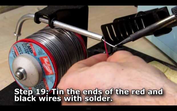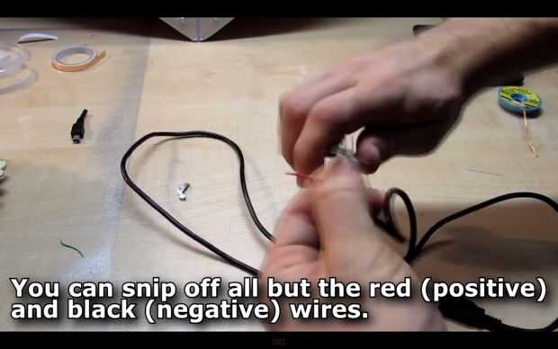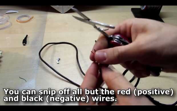 Con cuidado, tira de aproximadamente 1cm de los revestimientos del extremo del rojo (positivo) y los cables negro (negativo) y retuerza los alambres cobre juntos.
